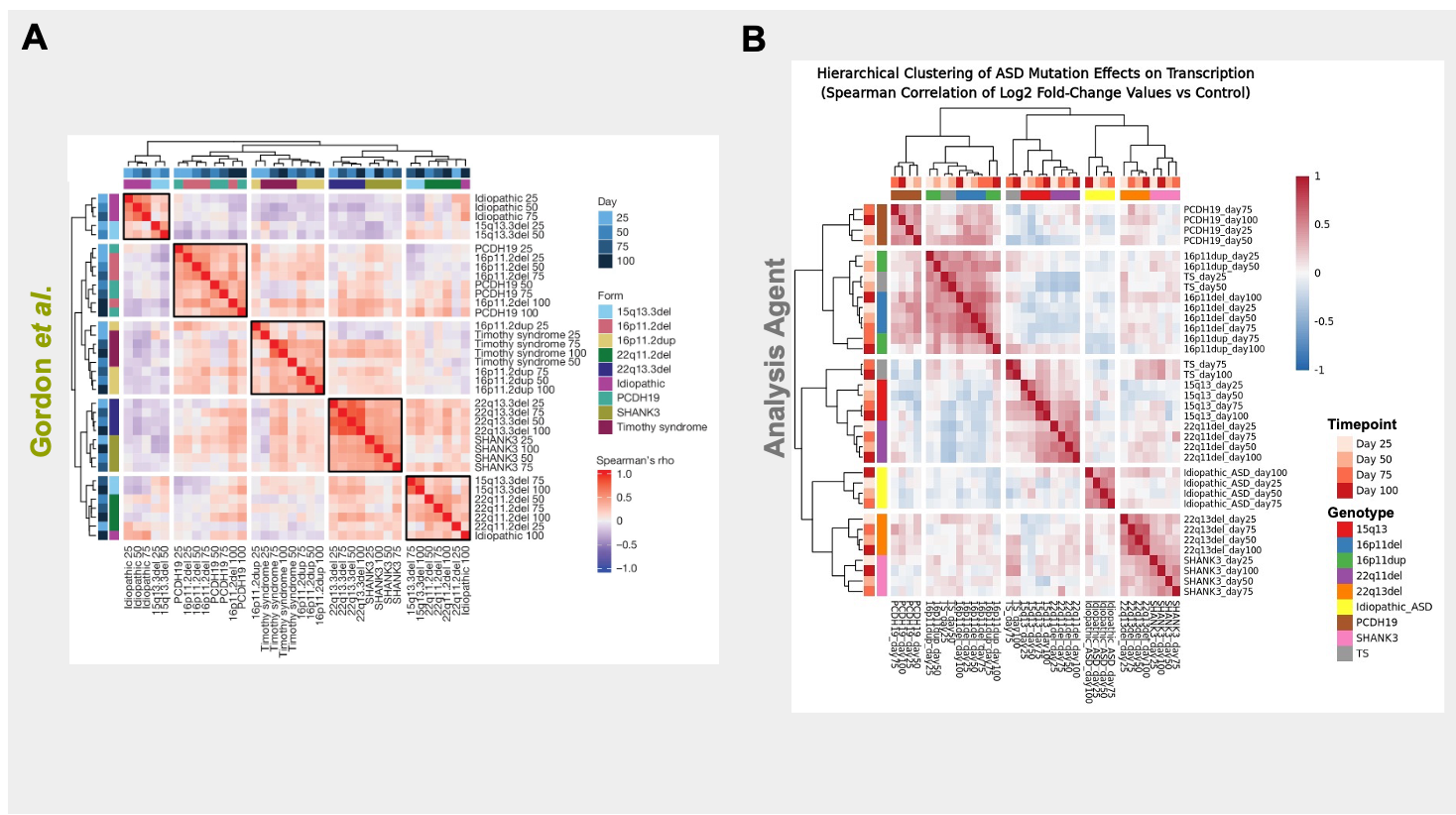 ... Calculate Spearman correlations of the resulting log-fold change (logFC) values across conditions. Perform hierarchical clustering. Plot and visualize the clustering result as a heatmap to show how different ASD forms cluster together as development progresses
